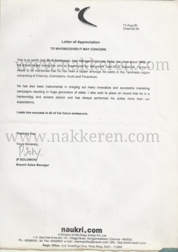 - I find Nakkeren to be very diligent, responsible and energetic. Once he takes ownership, he is relentless to bring it to completion through his constant follow-ups.
