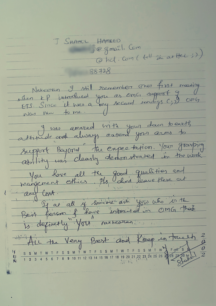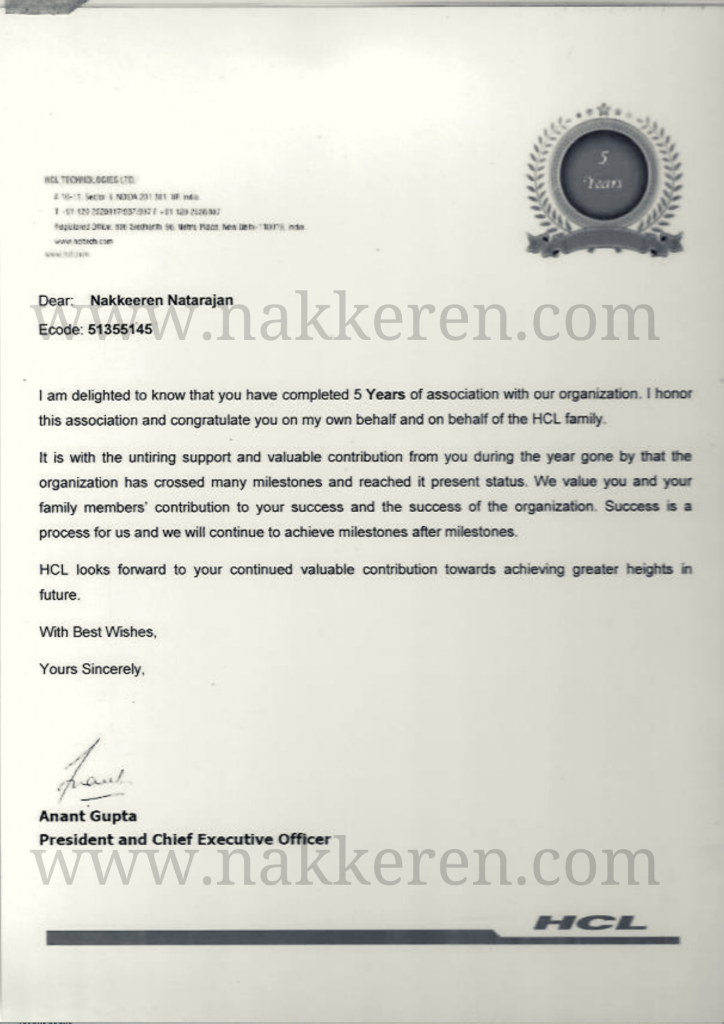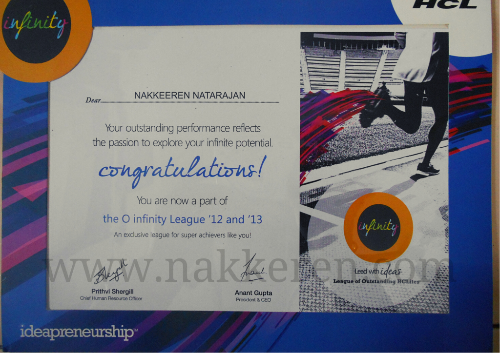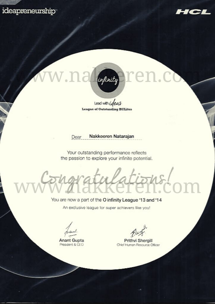 – Nakkeren is sincere, hardworking and result-oriented. He is full of initiative and proactiveness. Successfully launched Operations into a new territory. He has given best in class performance on some of key performance parameters. Tools Deployment process is conceptualized and rolled-out by him and is showing significant savings.