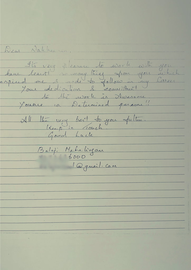 -I was amazed with your down to earth attitude and always extend your arms to support “Beyond” the expectation. Your grasping ability was clearly demonstrated in the work. You have all the good qualities and management ethics.
